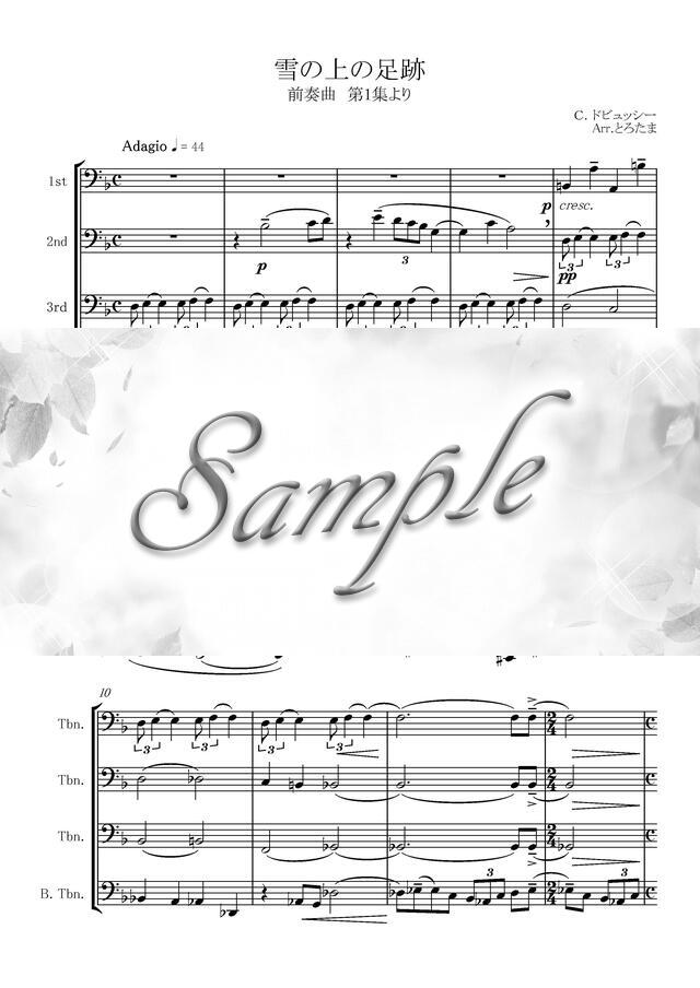 - ドビュッシーの前奏曲集第1集より「雪の上の足跡」をトロンボーン4重奏にしました。最高音は1stのハイB♭、最低音はBassのペダルB♭、曲の長さは3分40秒位です。パート譜4枚、スコア3枚のセットになります。Siberius7firstで作成しました。楽器で試し吹きしていないため、おかしなところがありましたら手直しして使って下さい。