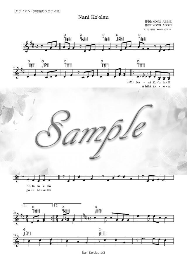 Nani Ko’olau【ハワイアン・弾き語りメロディ譜】 コンビニプリント対応