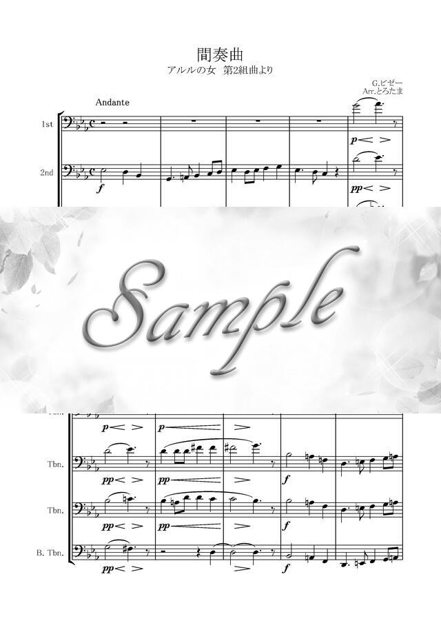 - ビゼーの「アルルの女」第2組曲よりより「間奏曲」をトロンボーン4重奏にしました。最高音は1stのハイB♭上のC、最低音はペダルB♭、曲の長さは4分30秒位です。パート譜4枚、スコア6枚のセットになります。Siberius7firstで作成しました。楽器で試し吹きしていないため、おかしなところがありましたら手直しして使って下さい。
