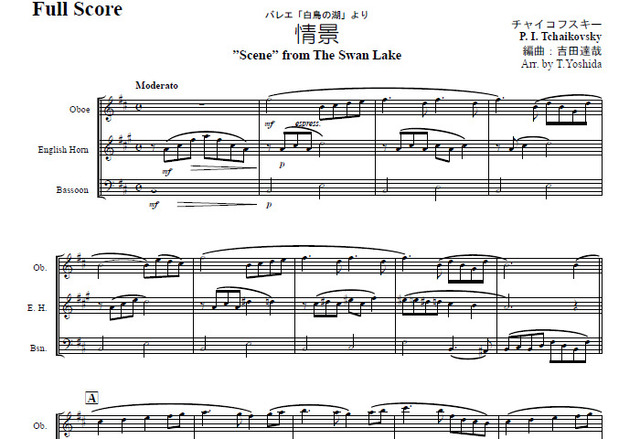 ■♪チャイコフスキーのバレエ音楽≪白鳥の湖≫ の中でもっとも有名な曲「情景」をダブルリード3重奏で演奏してみましょう。もちろん冒頭のメロディはオーボエの担当です。オケと同じ調ですので原曲を演奏されたことがある方は経験が生かせます。感情をこめて、素敵なソロを聞かせてください。