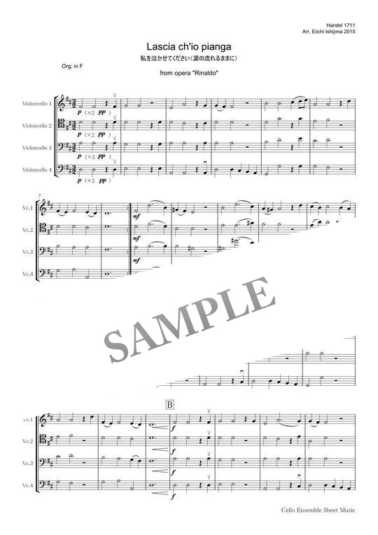 ヘンデル作曲「私を泣かせてください(涙の流れるままに)」チェロ四重奏版スコア コンビニプリント対応