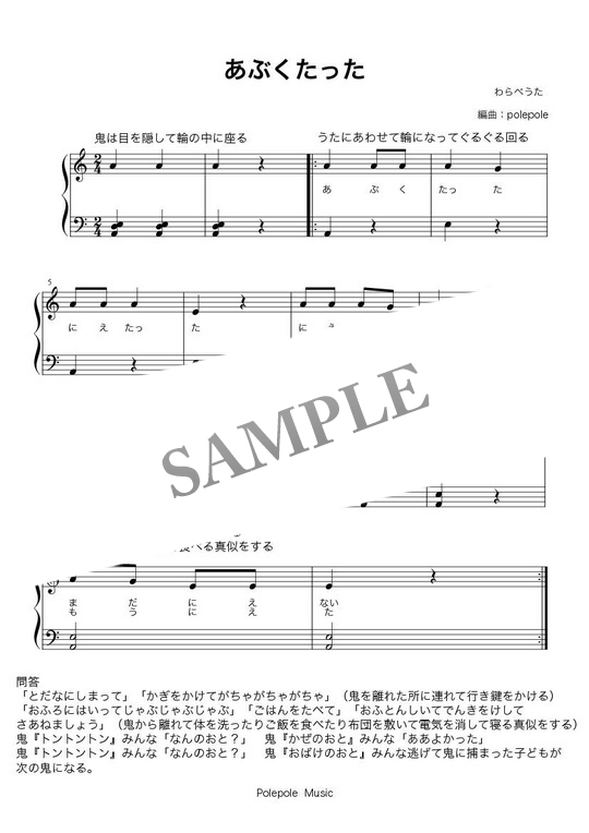 わらべうた「あぶくたった』弾き歌い楽譜 コンビニプリント対応