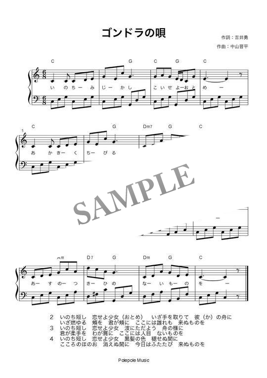 「ゴンドラの唄」弾き歌い楽譜 コンビニプリント対応