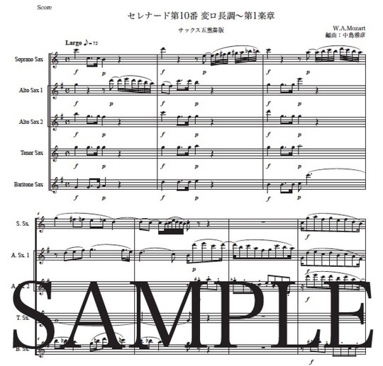 モーツァルト「セレナード第10番 変ロ長調~第1楽章」サックス五重奏版 コンビニプリント対応