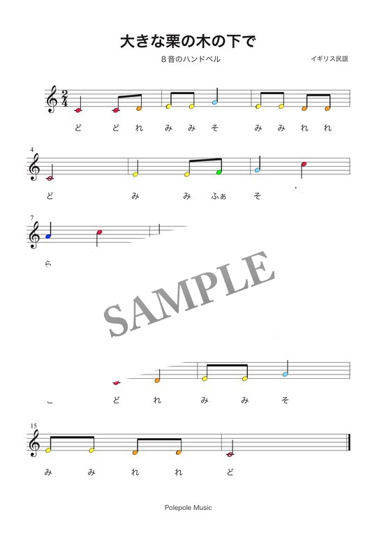 8音のハンドベル「大きな栗の木の下で」色音符メロディー譜 コンビニプリント対応