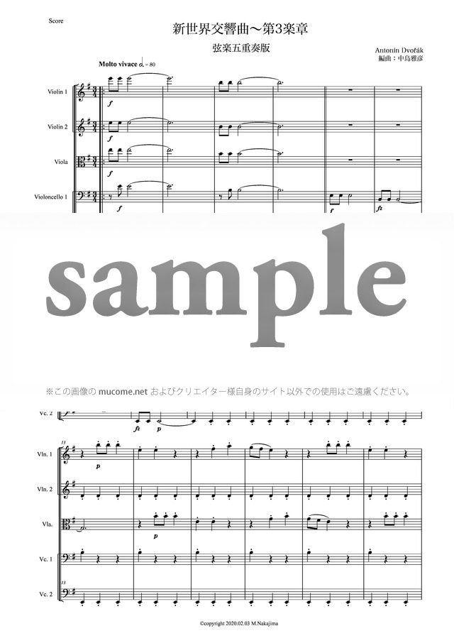 ドヴォルザーク「新世界交響曲~第3楽章」弦楽五重奏版 コンビニプリント対応