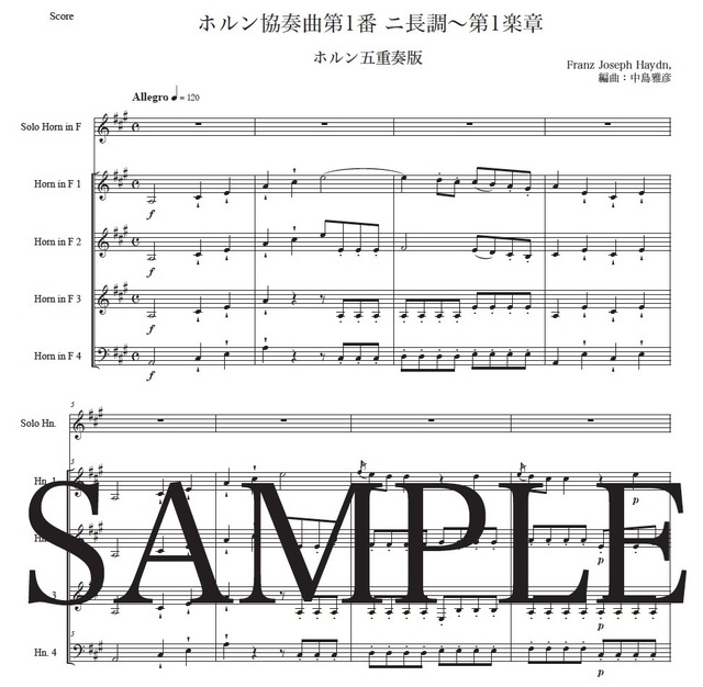 ハイドン「ホルン協奏曲第1番ニ長調~第1楽章」ホルン五重奏版 コンビニプリント対応