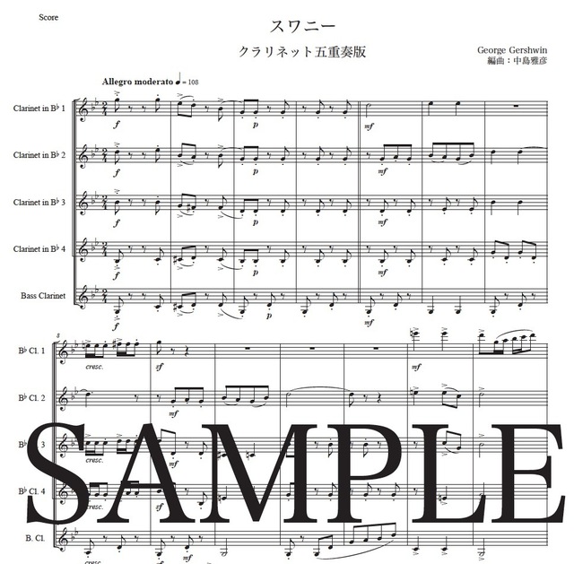 ガーシュウィン「スワニー」クラリネット五重奏版 コンビニプリント対応