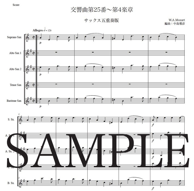 モーツァルト「交響曲第25番~第4楽章」サックス五重奏版 コンビニプリント対応