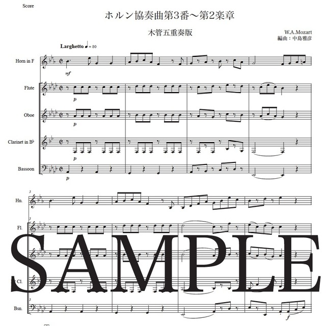モーツァルト「ホルン協奏曲第3番~第2楽章」木管五重奏版 コンビニプリント対応