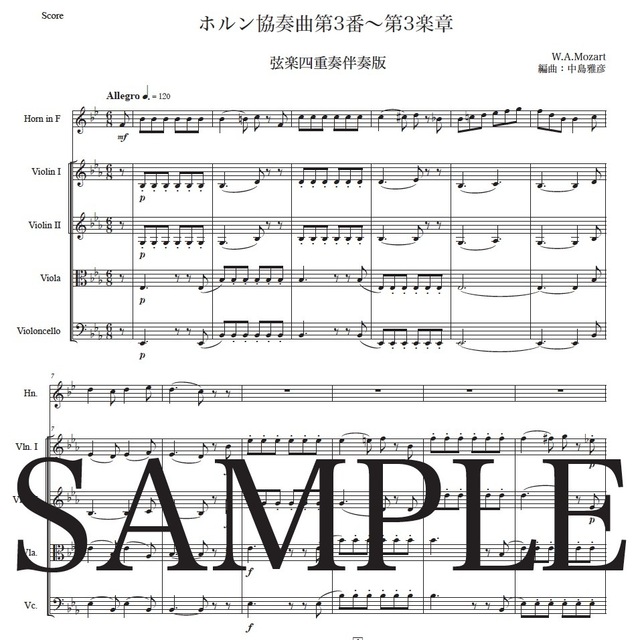 モーツァルト「ホルン協奏曲第3番~第3楽章」弦楽四重奏伴奏版 コンビニプリント対応