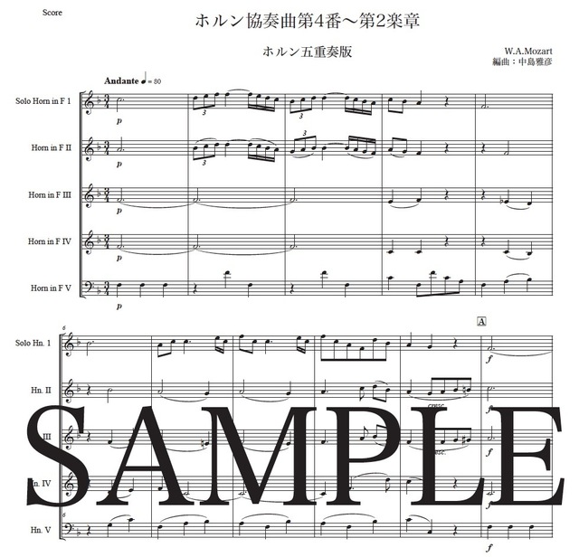モーツァルト「ホルン協奏曲第4番~第2楽章」ホルン五重奏版 コンビニプリント対応