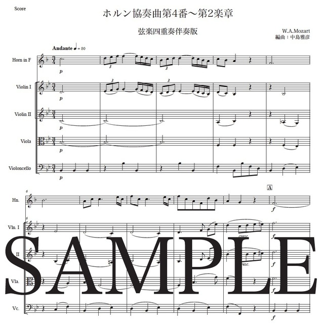 モーツァルト「ホルン協奏曲第4番~第2楽章」弦楽四重奏伴奏版 コンビニプリント対応