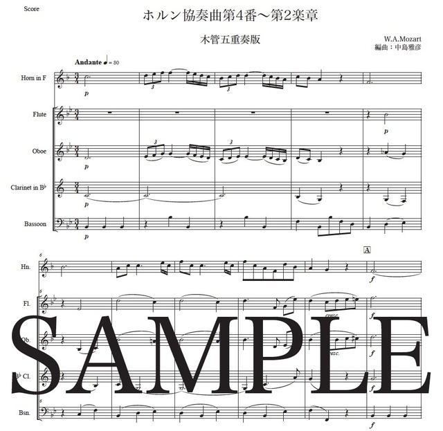 モーツァルト「ホルン協奏曲第4番~第2楽章」木管五重奏版 コンビニプリント対応
