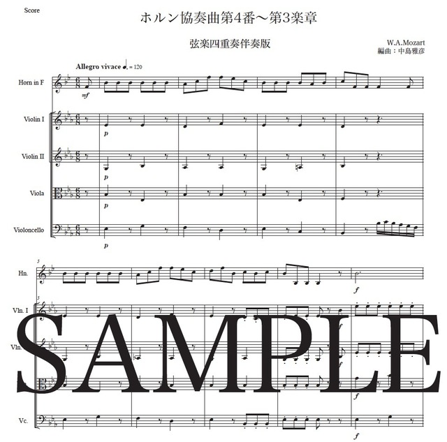 モーツァルト「ホルン協奏曲第4番~第3楽章」弦楽四重奏伴奏版 コンビニプリント対応