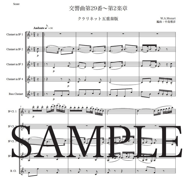 モーツァルト「交響曲第29番~第2楽章」クラリネット五重奏版 コンビニプリント対応
