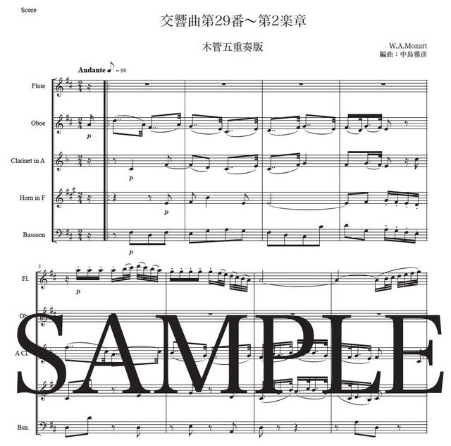 モーツァルト「交響曲第29番~第2楽章」木管五重奏版 コンビニプリント対応