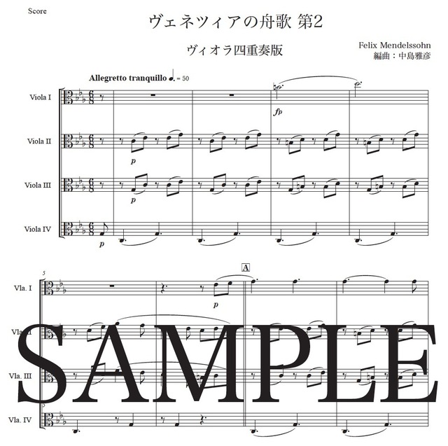 メンデルスゾーン「ヴェネツィアの舟歌 第2」ヴィオラ四重奏版 コンビニプリント対応