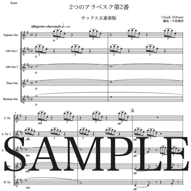ドビュッシー「2つのアラベスク第2番」サックス五重奏版 コンビニプリント対応
