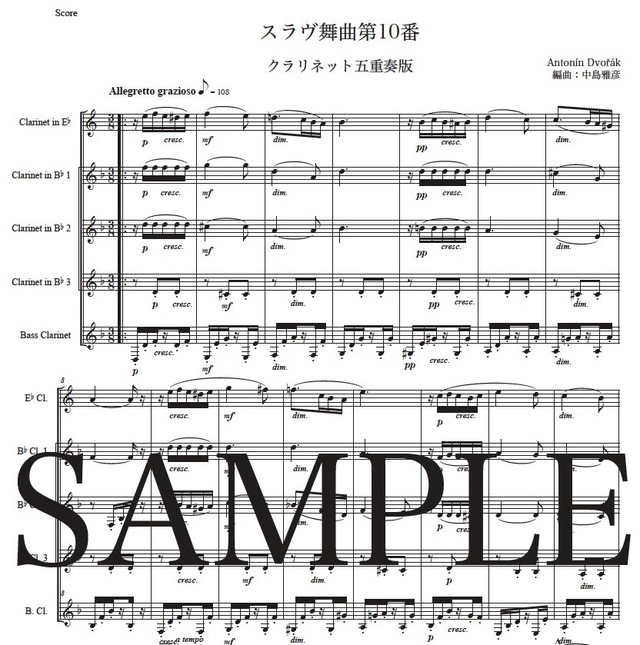 ドヴォルザーク「スラヴ舞曲第10番」クラリネット五重奏版 コンビニプリント対応