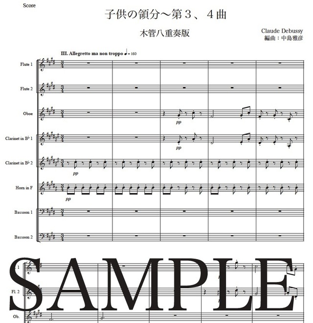 ドビュッシー「子供の領分~第3,4曲」木管八重奏版 コンビニプリント対応