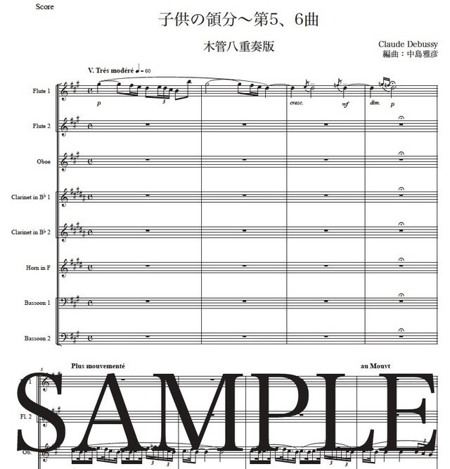 ドビュッシー「子供の領分~第5,6曲」木管八重奏版 コンビニプリント対応