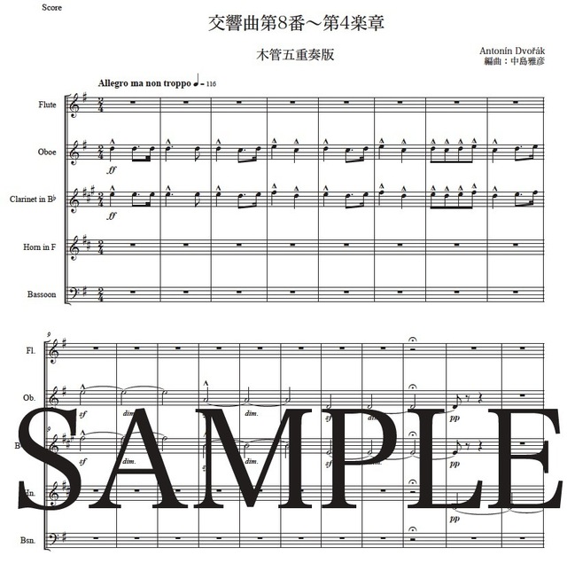 ドヴォルザーク「交響曲第8番~第4楽章」木管五重奏版 コンビニプリント対応
