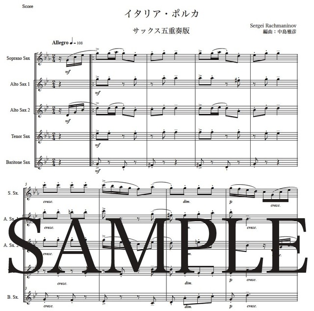 ラフマニノフ「イタリア・ポルカ」サックス五重奏版 コンビニプリント対応