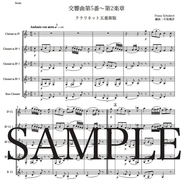シューベルト「交響曲第5番~第2楽章」クラリネット五重奏版 コンビニプリント対応