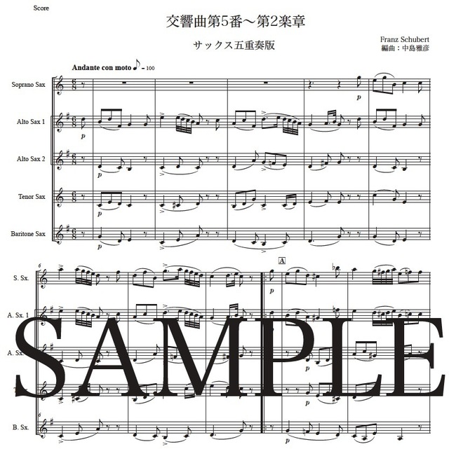 シューベルト「交響曲第5番~第2楽章」サックス五重奏版 コンビニプリント対応