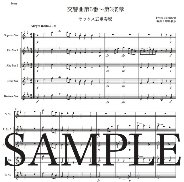 シューベルト「交響曲第5番~第3楽章」サックス五重奏版 コンビニプリント対応