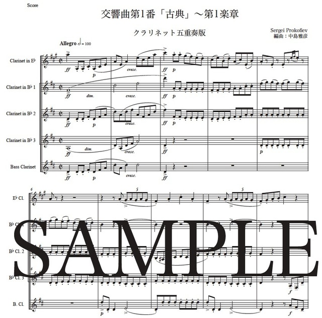 プロコフィエフ「古典交響曲~第1楽章」クラリネット五重奏版 コンビニプリント対応