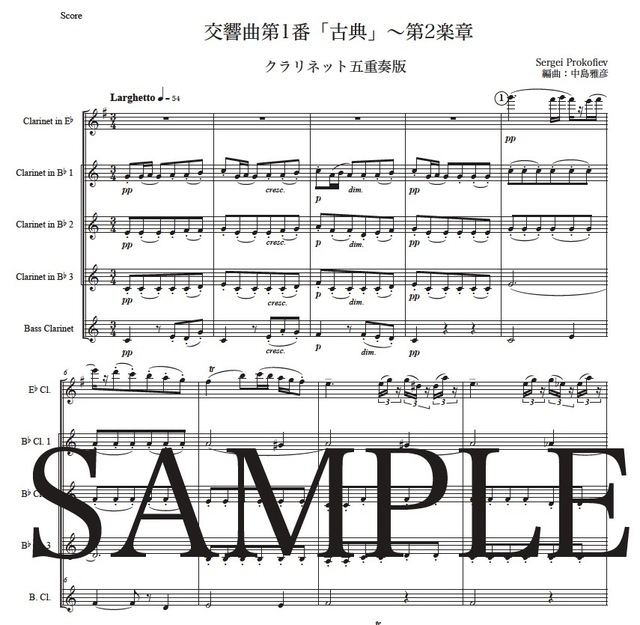 プロコフィエフ「古典交響曲~第2楽章」クラリネット五重奏版 コンビニプリント対応