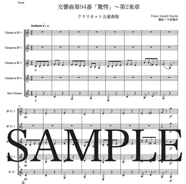ハイドン「交響曲第94番『驚愕』~第2楽章」クラリネット五重奏版 コンビニプリント対応