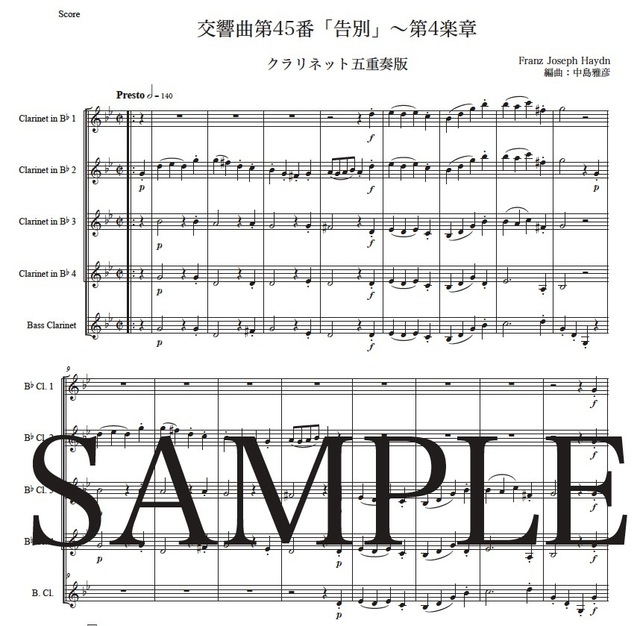 ハイドン「交響曲第45番『告別』~第4楽章」クラリネット五重奏版 コンビニプリント対応