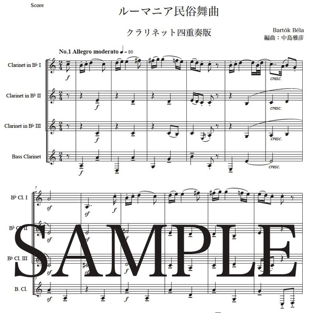 バルトーク「ルーマニア民俗舞曲」クラリネット四重奏版 コンビニプリント対応