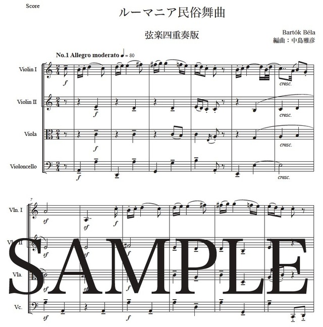 バルトーク「ルーマニア民俗舞曲」弦楽四重奏版 コンビニプリント対応