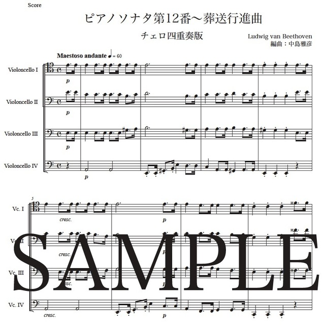 ベートーヴェン「ピアノソナタ第12番~葬送行進曲」チェロ四重奏版 コンビニプリント対応