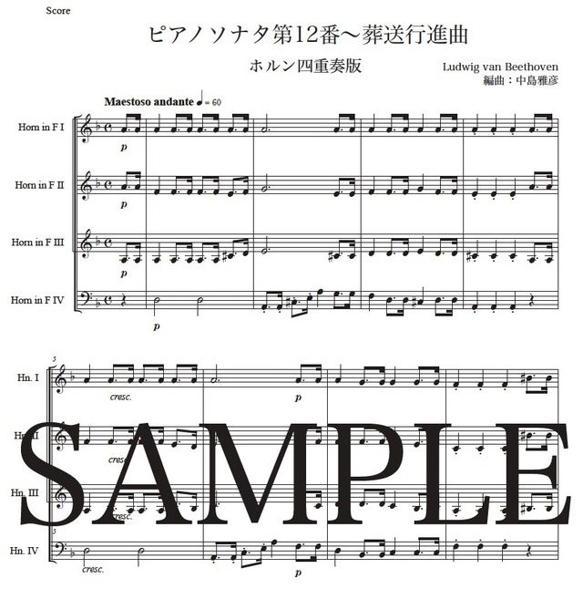 ベートーヴェン「ピアノソナタ第12番~葬送行進曲」ホルン四重奏版 コンビニプリント対応