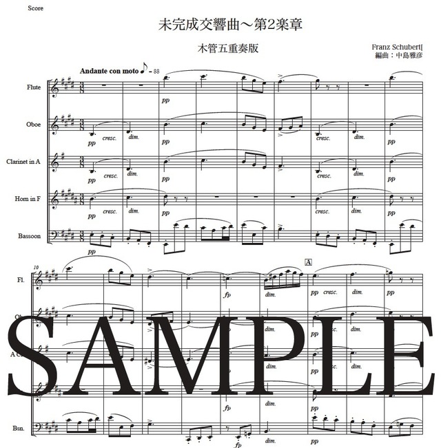 シューベルト「未完成交響曲~第2楽章」木管五重奏版 コンビニプリント対応