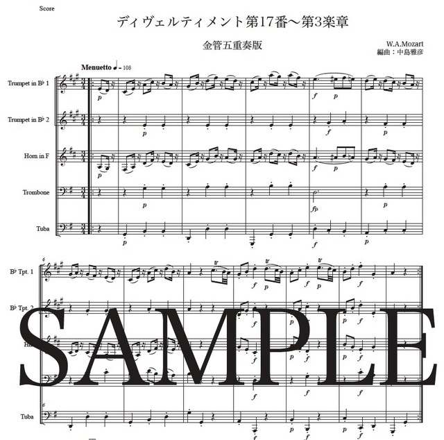 モーツァルト「ディヴェルティメント第17番~第3楽章」金管五重奏版 コンビニプリント対応