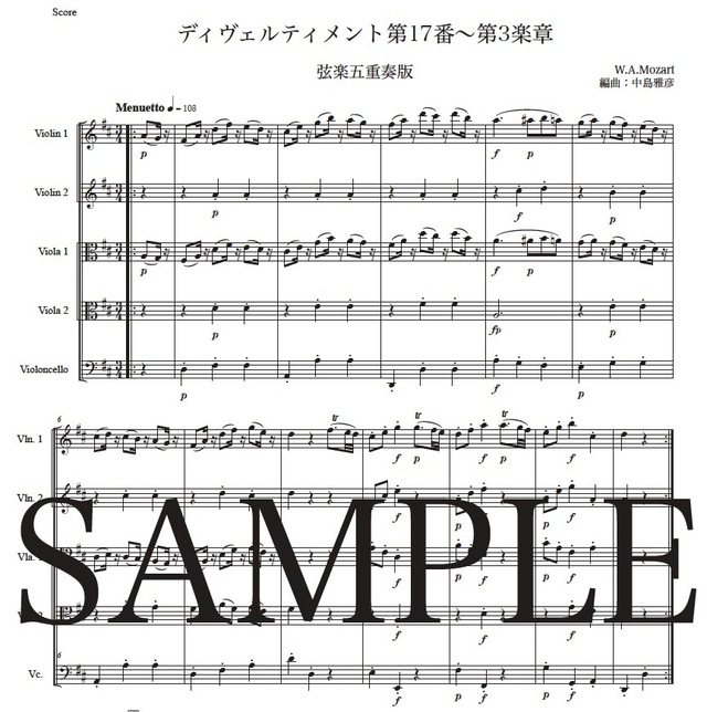 モーツァルト「ディヴェルティメント第17番~第3楽章」弦楽五重奏版 コンビニプリント対応