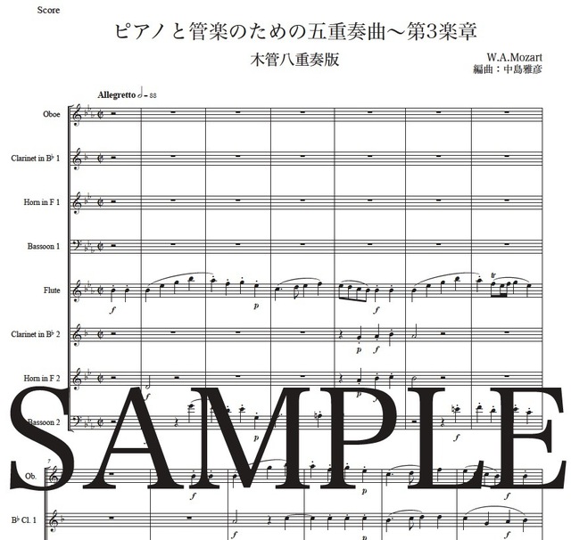 モーツァルト「ピアノと管楽のための五重奏曲~第3楽章」木管八重奏版 コンビニプリント対応