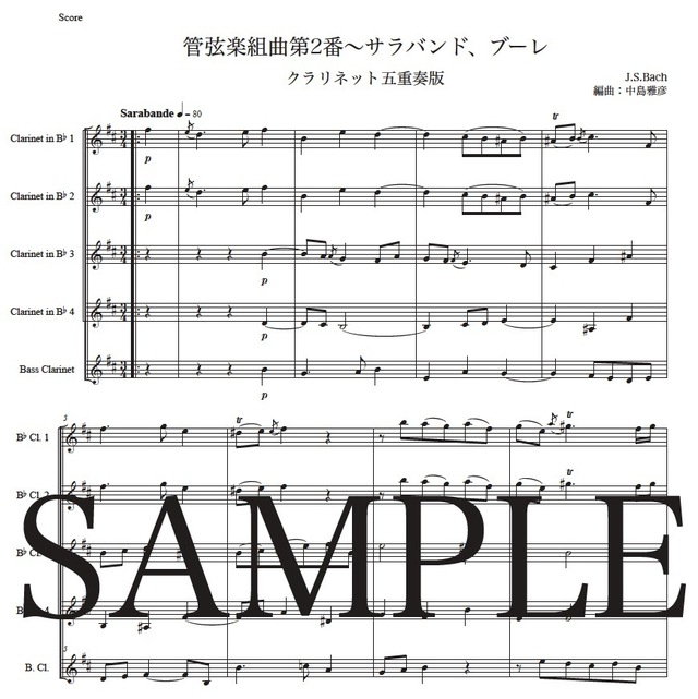 バッハ「管弦楽組曲第2番~サラバンド、ブーレ」クラリネット五重奏版 コンビニプリント対応