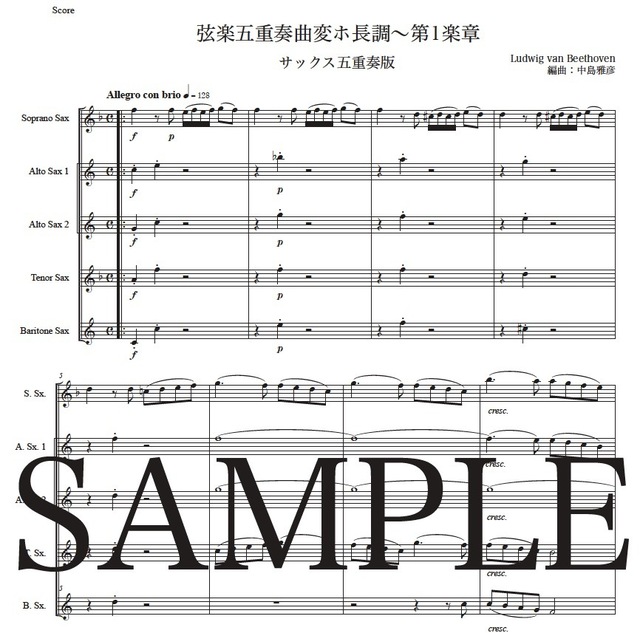 ベートーヴェン「弦楽五重奏曲変ホ長調~第1楽章」サックス五重奏版 コンビニプリント対応