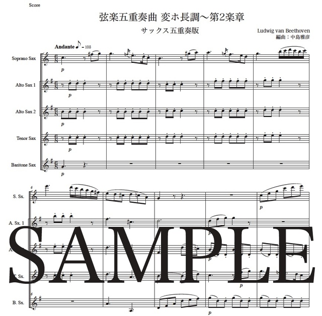ベートーヴェン「弦楽五重奏曲変ホ長調~第2楽章」サックス五重奏版 コンビニプリント対応