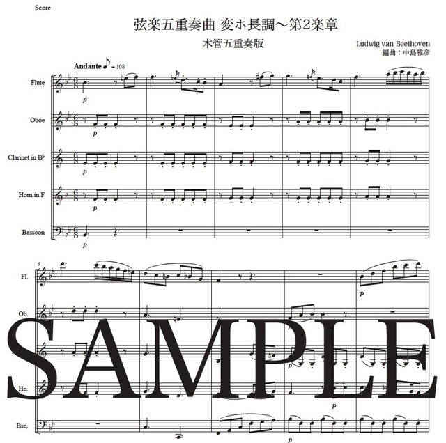 ベートーヴェン「弦楽五重奏曲変ホ長調~第2楽章」木管五重奏版 コンビニプリント対応