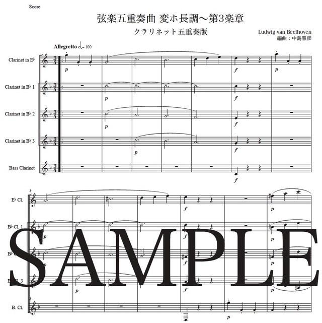 ベートーヴェン「弦楽五重奏曲変ホ長調~第3楽章」クラリネット五重奏版 コンビニプリント対応