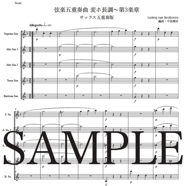 ベートーヴェン「弦楽五重奏曲変ホ長調~第3楽章」サックス五重奏版 コンビニプリント対応
