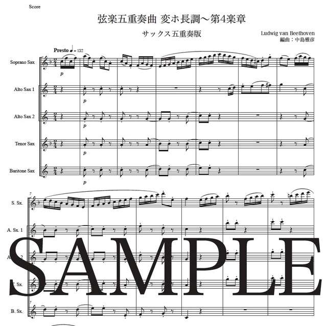 ベートーヴェン「弦楽五重奏曲変ホ長調~第4楽章」サックス五重奏版 コンビニプリント対応